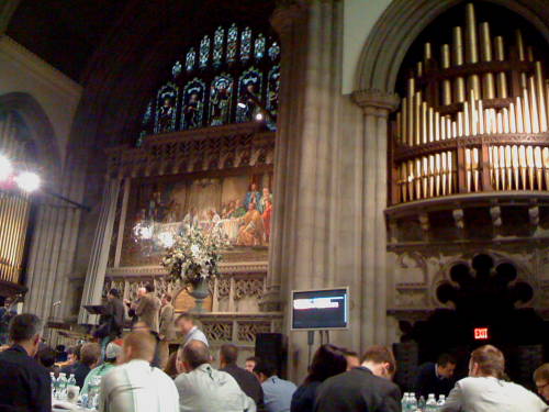 Around 400 church diverse church planters–some wearing suits, others wearing faux-hawks and tattoos–gathered on the edge of Central Park in an 170-year-old, baroque church building owned by the Fourth Universalist Society in upper Manhattan. You get a sense of the impressive architecture, stained glass, paintings, and pipe organ from this photo I took with my phone.