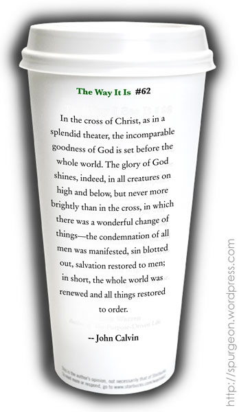 […] This Was On A Starbucks Cup… Posted by 1031toglory under John Calvin Courtesy of Tony Reinke who writes at Miscellanies … by the way, they’re closing down the Starbucks in our area… stinks, since it […]