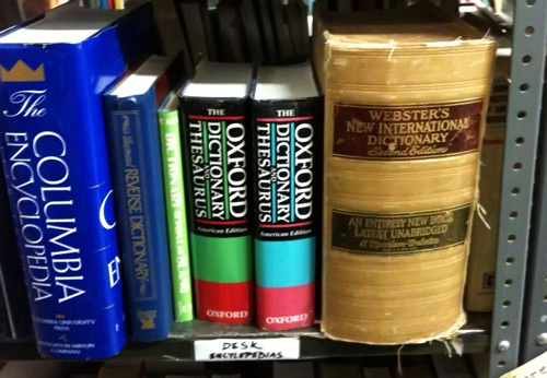 The Philistines of literature live in the reference section. This is where unabridged dictionaries walk. On Monday, while out on a used book hunting trip with the family, I spotted this beast—the 3,200 page Webster’s New International Dictionary, Second Edition (1937). Its neighbor, the Oxford dictionary weighs 5.4 pounds. I tried holding the Webster. I’d guess it weighs over 30 pounds, the Goliath of reference books. (Sure makes me thankful for online dictionaries!)