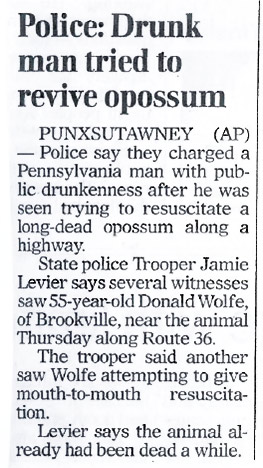 For the man’s sake, it’s a good thing the opossum was actually dead and not unconscious. Had it only been temporarily stunned, the headline may have read something like: “Drunk Man Mauled in Face by Opossum” So strange and so funny. Thanks for sharing.