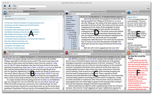 To illustrate I’ll show you how I access my collection of commentaries through the “passage guide” (click the following image for a larger view). I’ve typed “John 3:16” in the search bar and all the available commentaries are listed in the top left box (A). My favored commentaries will rank highest, a feature I’ll explain later. I’ve selected three commentaries which all open to the exact spot I need. They include the Baker Exegetical Commentary by Andreas Köstenberger (B), the New American Commentary by Gerald Borchert (C), and of course Don Carson’s commentary in the Pillar series (D). Notice on Carson’s commentary I have opened up the drop-down outline of the book, making it easy to see where I’m at in the overall book. For this photo-op I’ve opened two other handy utility windows, an ESV Bible (F) and a handy little information window that automatically looks up whatever my cursor hovers over (D). In this case my cursor was hovering over a reference to Ex 34:6–7. Click on the picture for a larger view: