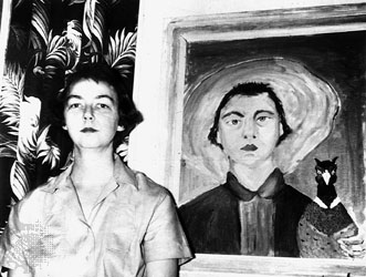 Letter dated June 19, 1963: “In the self portrait that is not a peacock. That’s a pheasant cock. I used to raise pheasants but they got too much for me as they require attention and have to be caged. The peacocks take care of themselves. But I like very much the look of the pheasant cock. He has horns and a face like the devil. The self-portrait was made ten years ago, after a very acute siege of lupus. I was taking cortisone which gives you what they call a moon-face and my hair had fallen out to a large extent from the high fever, so I looked pretty much like the portrait. When I painted it I didn’t look either at myself in the mirror or at the bird. I knew what we both looked like.”